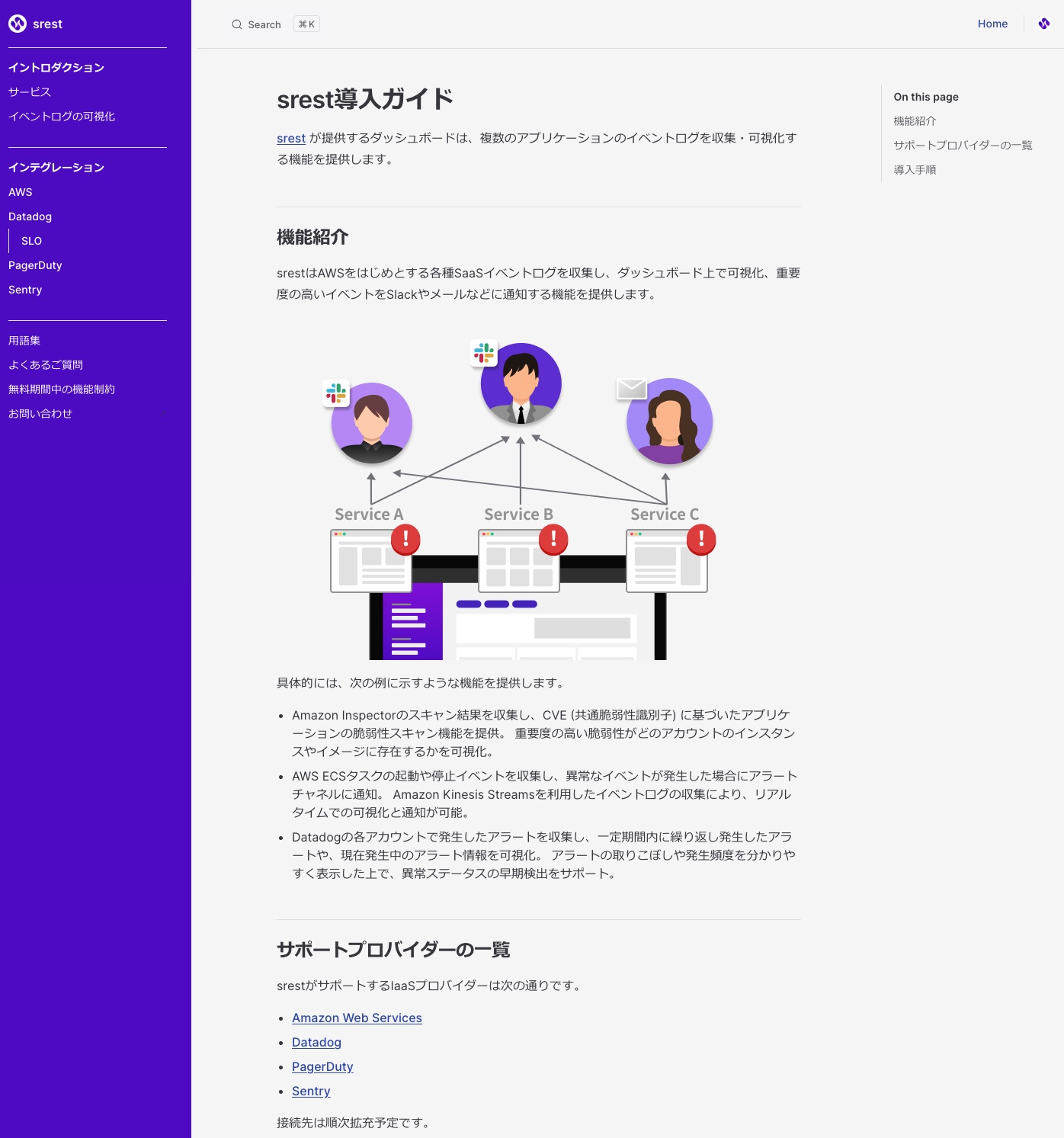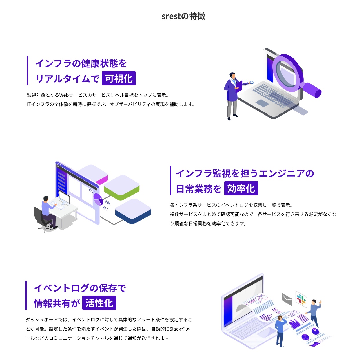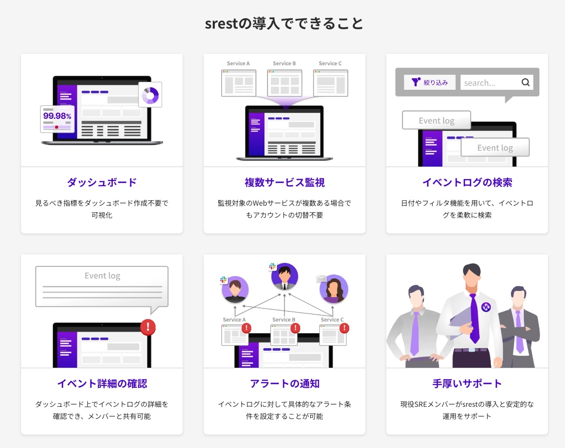 また、SREをこれから推進しようとする際、モニタリングから始めるケースでも、必要な知見が不足していたり、SREの人材確保が難しく、十分な工数が取れない場合があります。そうした中、「srest」を利用すれば、これらの課題を自動で一元化し、解決してくれるサービスとなっています。