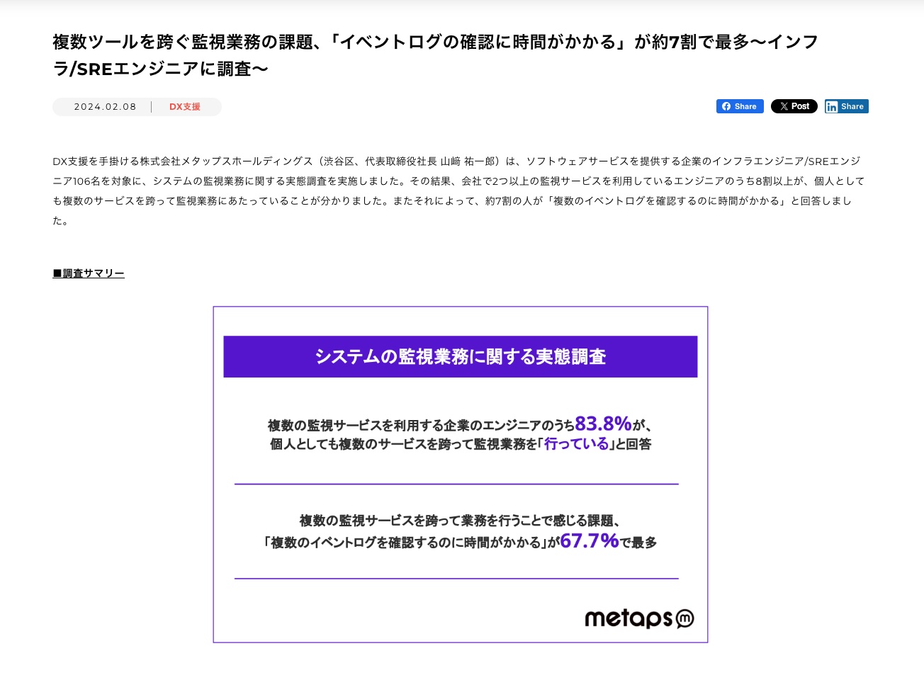 ・複数ツールを跨ぐ監視業務の課題、「イベントログの確認に時間がかかる」が約7割で最多~インフラ/SREエンジニアに調査~