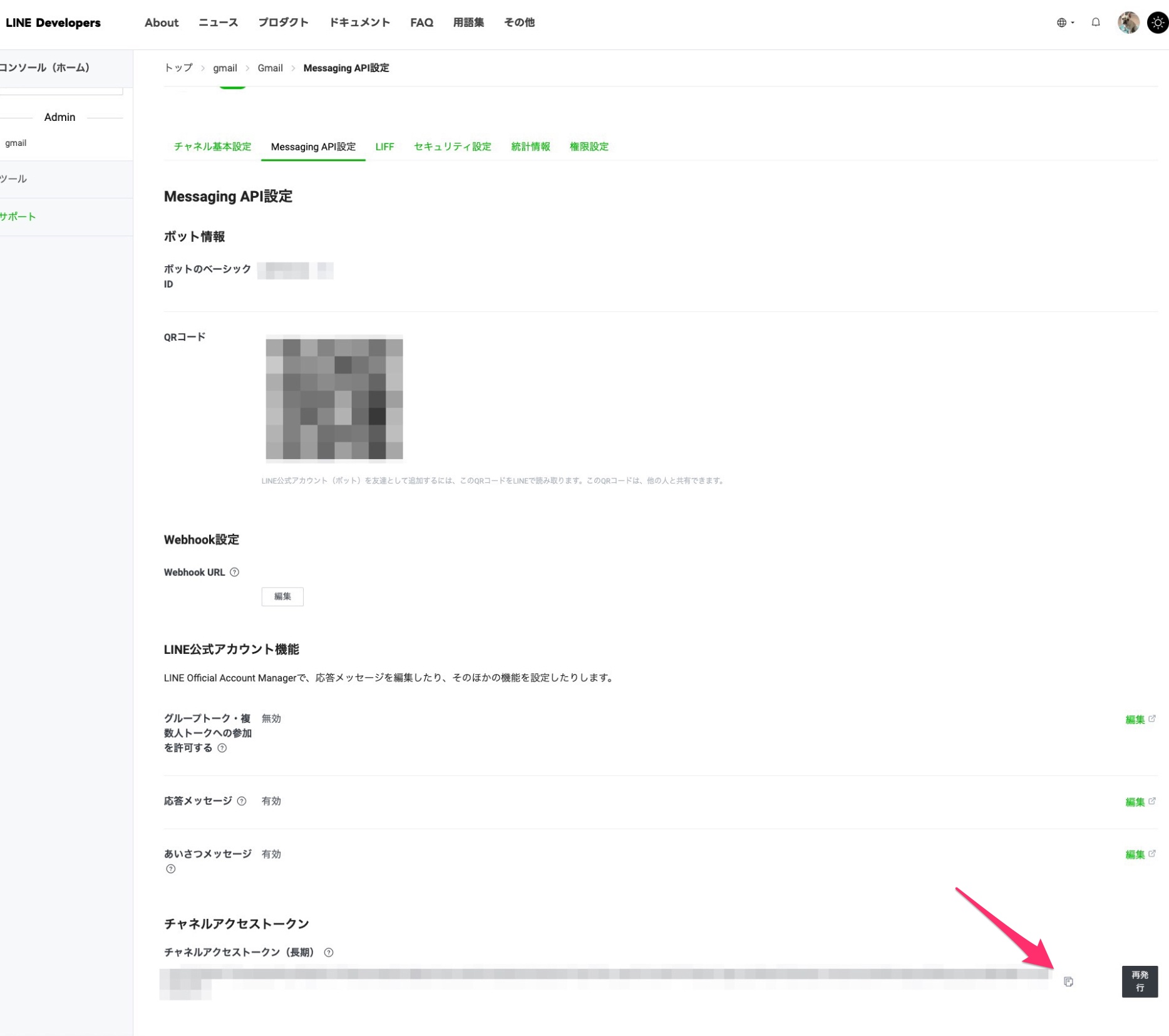 - 対象のチャネルからMessaging API設定でチャネルアクセストークンを発行