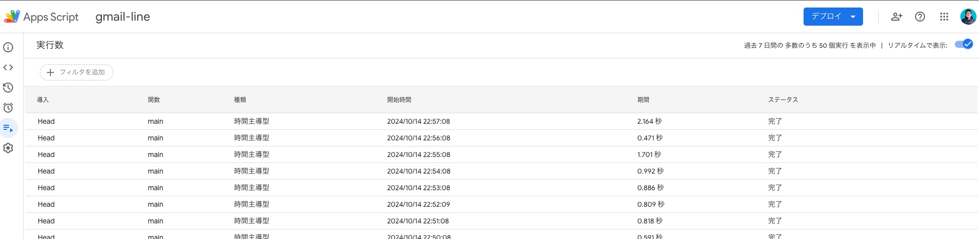 LINEBOT_CHANNEL_TOKEN はチャネルアクセストークンの指定と、 GMAIL_QUERY はGmailのラベルを指定してください。 MAX_THREADS ではGmailのAPI制限に引っかからないように10通までを上限としています。それと毎回Gmailでの未読メールを管理するのがめんどくさいため、LINEで通知されたら新着メールを既読するようにしました。