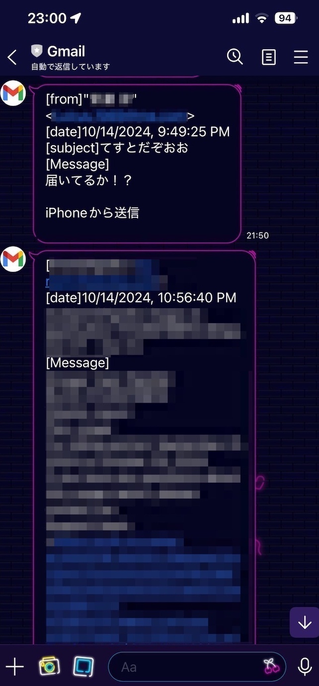 const LINEBOT_CHANNEL_TOKEN = 'xxxxx'; //チャネルアクセストークン const GMAIL_QUERY = "is:unread label:hoge"; //Gmailのラベルを指定 const MAX_THREADS = 10; //10通まで function main() { const threads = GmailApp.search(GMAIL_QUERY, 0, MAX_THREADS); threads.forEach(thread => { const message = thread.getMessages().pop(); // 最新メッセージを取得 const messageBody = message.getPlainBody().substring(0, 500); // 本文の500文字まで取得 const formattedMessage = `[from]${message.getFrom()}\n` + `[date]${message.getDate().toLocaleString()}\n` + `[subject]${message.getSubject()}\n` + `[Message]${messageBody}\n`; pushMessageToLineBot(formattedMessage); message.markRead(); // メールを既読に }); } function pushMessageToLineBot(message) { const options = { "method": "post", "headers": { "Content-Type": "application/json", "Authorization": `Bearer ${LINEBOT_CHANNEL_TOKEN}` }, "payload": JSON.stringify({ "messages": [{ "type": "text", "text": message }] }) }; UrlFetchApp.fetch("https://api.line.me/v2/bot/message/broadcast", options); } |