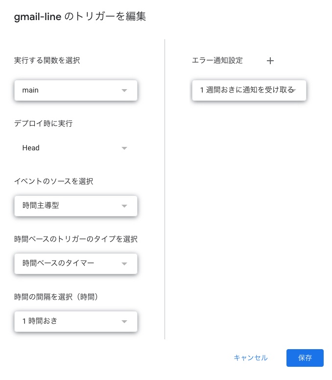 1時間に一回にしないとLINEのAPI制限に引っかかるので気をつけましょう。分単位で実行したい場合は課金するしかなさそう。