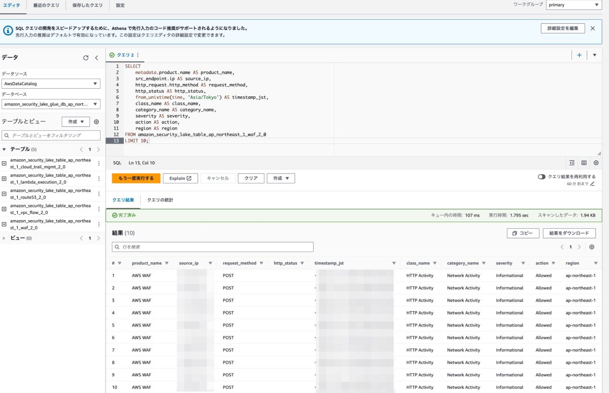 ちなみにリソース等すべて削除する場合は、GlueのDBとS3バケットを削除しないとTerraform側でエラーが止まらないので気をつけましょう。試しにAthenaでWAFのテーブルをクエリ叩くと以下のように値が出てくれば完了です。