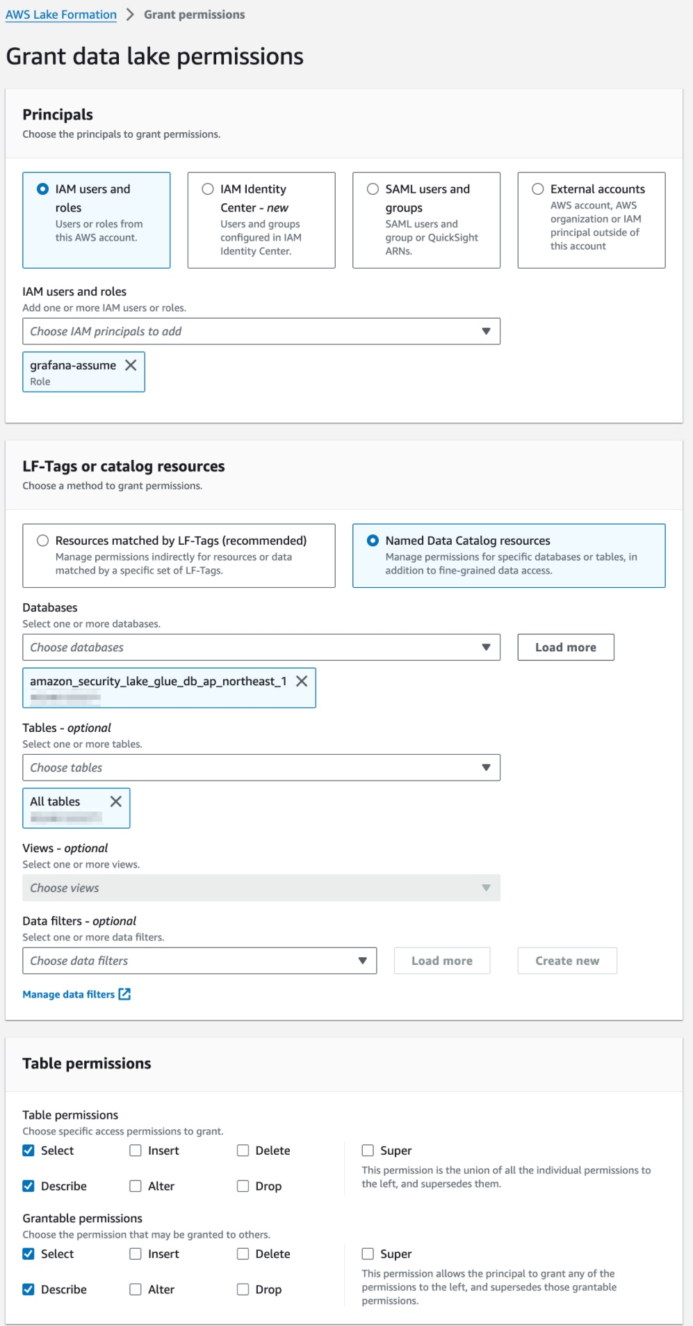 resource "aws_lakeformation_permissions" "security_lake_permissions" { principal = aws_iam_service_linked_role.security_lake_resource_management.arn permissions = ["ALTER", "DESCRIBE"] table { database_name = "amazon_security_lake_glue_db_ap_northeast_1" wildcard = true } } resource "aws_lakeformation_permissions" "grafana_permissions_ap_northeast_1" { principal = aws_iam_role.grafana.arn permissions = ["DESCRIBE", "SELECT"] permissions_with_grant_option = ["SELECT", "DESCRIBE"] table { database_name = "amazon_security_lake_glue_db_ap_northeast_1" wildcard = true } } |