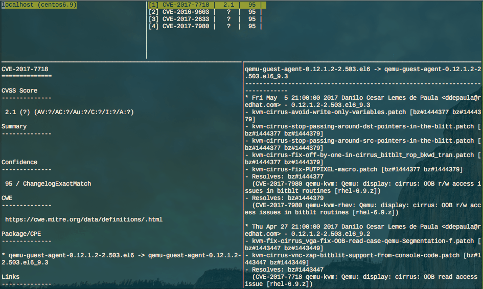 vuls $ vuls scan [May 23 15:34:05] INFO [localhost] Start scanning [May 23 15:34:05] INFO [localhost] config: /home/vuls/config.toml [May 23 15:34:05] INFO [localhost] Validating config... [May 23 15:34:05] INFO [localhost] Detecting Server/Container OS... [May 23 15:34:05] INFO [localhost] Detecting OS of servers... [May 23 15:34:05] INFO [localhost] (1/1) Detected: localhost: centos 6.9 [May 23 15:34:05] INFO [localhost] Detecting OS of containers... [May 23 15:34:05] INFO [localhost] Detecting Platforms... [May 23 15:34:16] INFO [localhost] (1/1) localhost is running on other [May 23 15:34:16] INFO [localhost] Scanning vulnerabilities... [May 23 15:34:16] INFO [localhost] Scanning vulnerable OS packages... [May 23 15:34:26] INFO [localhost] (1/2) Scanned mysql-community-release-el6-5 -> el6-7 : [] [May 23 15:34:26] INFO [localhost] (2/2) Scanned qemu-guest-agent-0.12.1.2-2.503.el6 -> 0.12.1.2-2.503.el6_9.3 : [CVE-2016-9603 CVE-2017-2633 CVE-2017-7980 CVE-2017-7718] One Line Summary ================ localhost centos6.9 4 CVEs 2 updatable packages To view the detail, vuls tui is useful. To send a report, run vuls report -h. |
