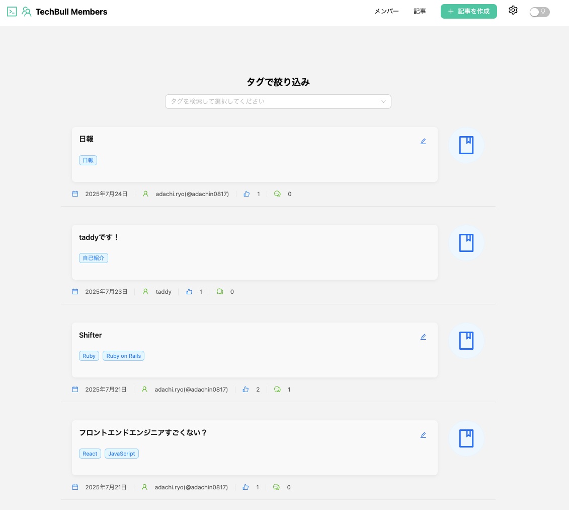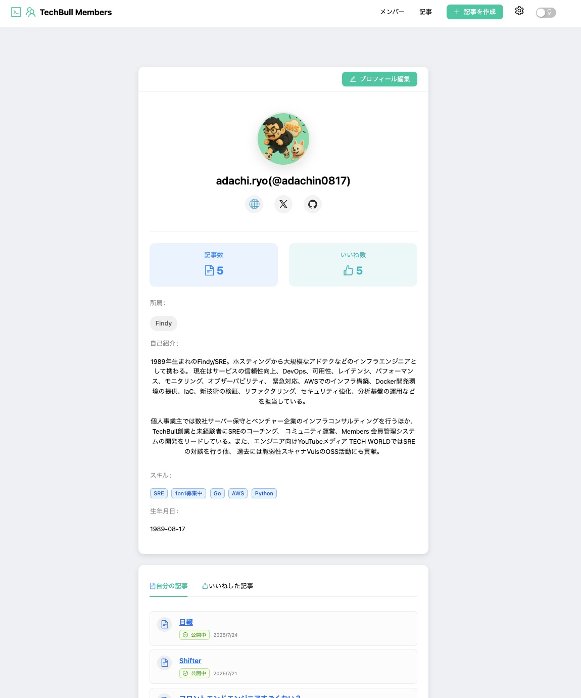 ようやくTechBullの会員管理システムであるMembersの実装が完了した。マイページでは記事投稿数や、いいね数が可視化されて、プロフィールの修正が直感的に仕上がった。メンバー一覧ではプロフィールから設定したスキルタグでどんな技術を勉強しているのか把握できるようにし、1on1も募集しているか一目見ただけで判断できるようにした。記事一覧ではロードマップを契約しているメンティーの日報や各メンバーの技術記事を書いて、いいねやコメントをできるようにしてみた。ダークモードも実装したが、カッコいい。