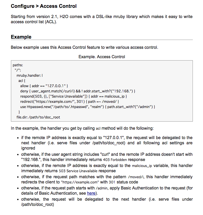 "adachin.com:443": listen: port: 443 ssl: certificate-file: /etc/letsencrypt/live/adachin.com/fullchain.pem key-file: /etc/letsencrypt/live/adachin.com/privkey.pem paths: "/": mruby.handler: | require "htpasswd.rb" acl { allow { addr == "xxx.xxx.xxx.xx1" } allow { addr == "xxx.xxx.xxx.xx2" } deny { user_agent.match(/curl/i) && ! addr.start_with?("192.168.") } use Htpasswd.new("/var/www/html/.htpasswd", "realm-name") { path.start_with?("/") } } file.dir: /var/www/html |