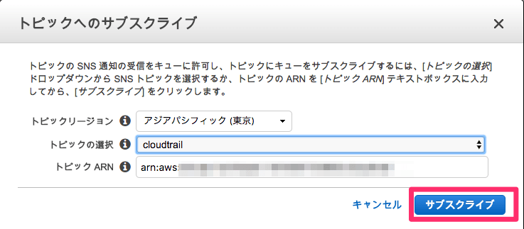 適当に認証情報を設定すると新しいSNSトピックの作成に適当なトピック名をぶち込みます。