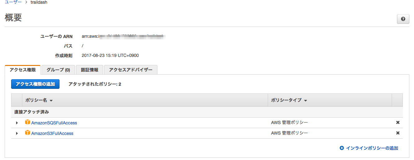 traildashユーザを作り、SQSとS3フルアクセスを権限追加します。