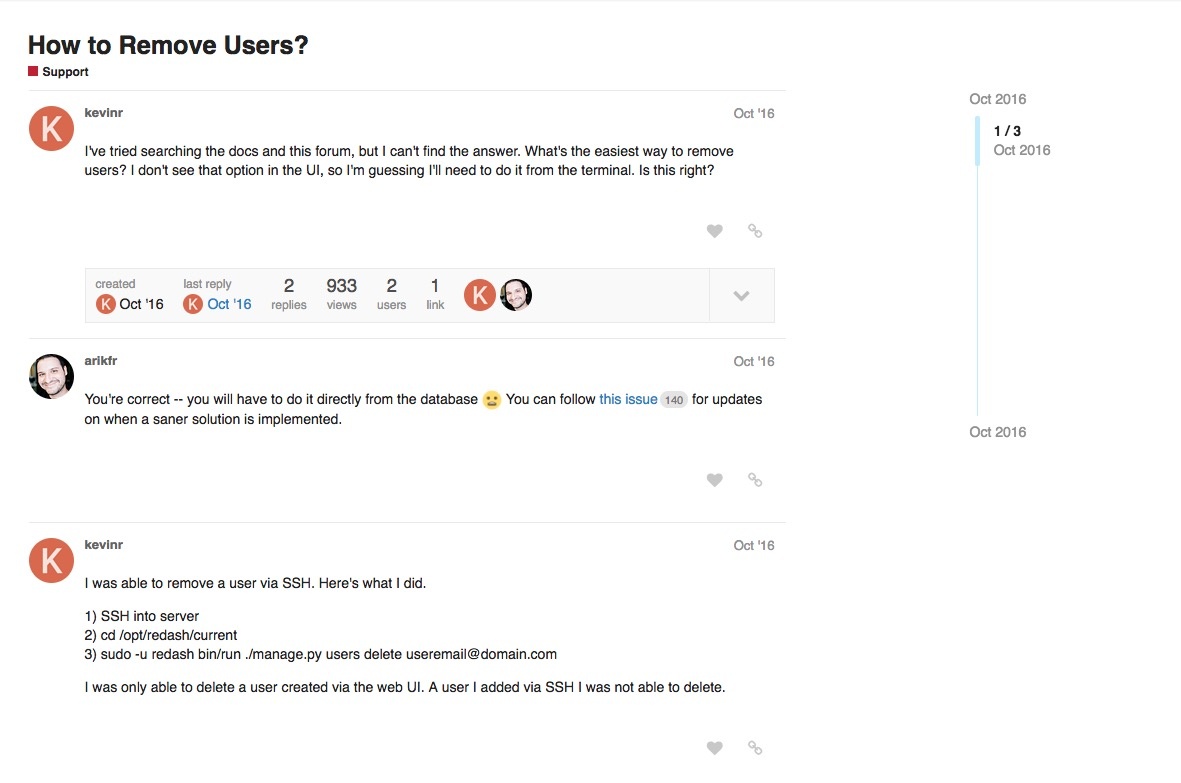 $ cd /opt/redash/current $ sudo -u redash bin/run ./manage.py users delete adachinpo@gmail.com Deleted 1 users. |