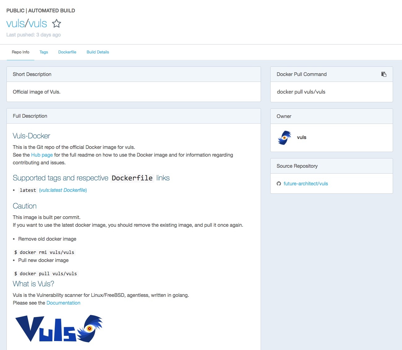 ・go-cve-dictionary # docker pull vuls/go-cve-dictionary # docker run --rm vuls/go-cve-dictionary -v go-cve-dictionary v0.1.1 a64c5fc ・goval-dictionary # docker pull vuls/goval-dictionary # docker run --rm vuls/goval-dictionary -v goval-dictionary fd8ff5a ・vuls # docker pull vuls/vuls # docker run --rm vuls/vuls -v vuls v0.4.1 00c690f |
