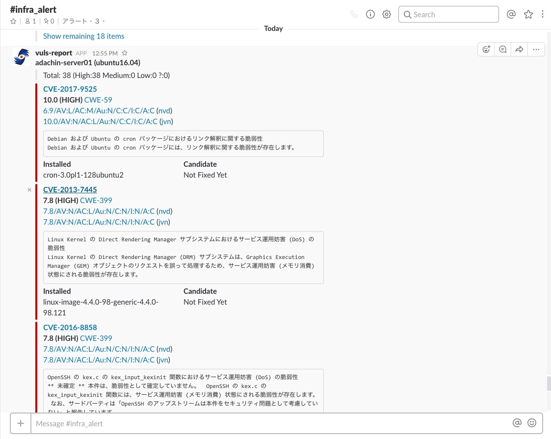 [slack] hookURL = "https://hooks.slack.com/services/zeeeeeeeeeeeeeeeeeeeeeeeeeeeeeeeeet" channel = "#infra_alert" authUser = "vuls-report" [servers] [servers.adachin-docker] host = "localhost" port = "local" [servers.adachin-server01] host = "xxx.xxxx.xxxx.xxxx." port = "22" user = "zeeeeeeeeeeet" keyPath = "/root/.ssh/zeeeeeeeeet" |
