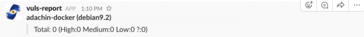 adachin-docker vuls # docker run --rm -it \ -v ~/.ssh:/root/.ssh:ro \ -v $PWD:/vuls \ -v $PWD/vuls-log:/var/log/vuls \ -v /etc/localtime:/etc/localtime:ro \ vuls/vuls report \ -cvedb-path=/vuls/cve.sqlite3 \ -ovaldb-path=/vuls/oval.sqlite3 \ -format-short-text \ -to-slack \ -lang=ja \ -cvss-over=7 \ -config=./config.toml |