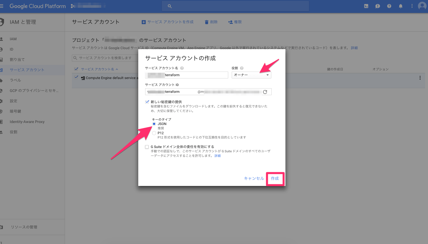 一旦役割はオーナーでキーのタイプはJSONにします。