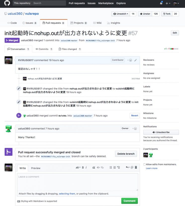 $ git status On branch master Your branch is ahead of 'origin/master' by 3 commits. (use "git push" to publish your local commits) #自分のリポジトリをmasterにpushしろと言われる nothing to commit, working tree clean $ git push origin master Counting objects: 18, done. Delta compression using up to 4 threads. Compressing objects: 100% (13/13), done. Writing objects: 100% (18/18), 2.60 KiB | 2.60 MiB/s, done. Total 18 (delta 10), reused 7 (delta 5) remote: Resolving deltas: 100% (10/10), completed with 3 local objects. To github.com:RVIRUS0817/vulsrepo.git xxxxxxxxxx..xxxxxxx master -> master |
