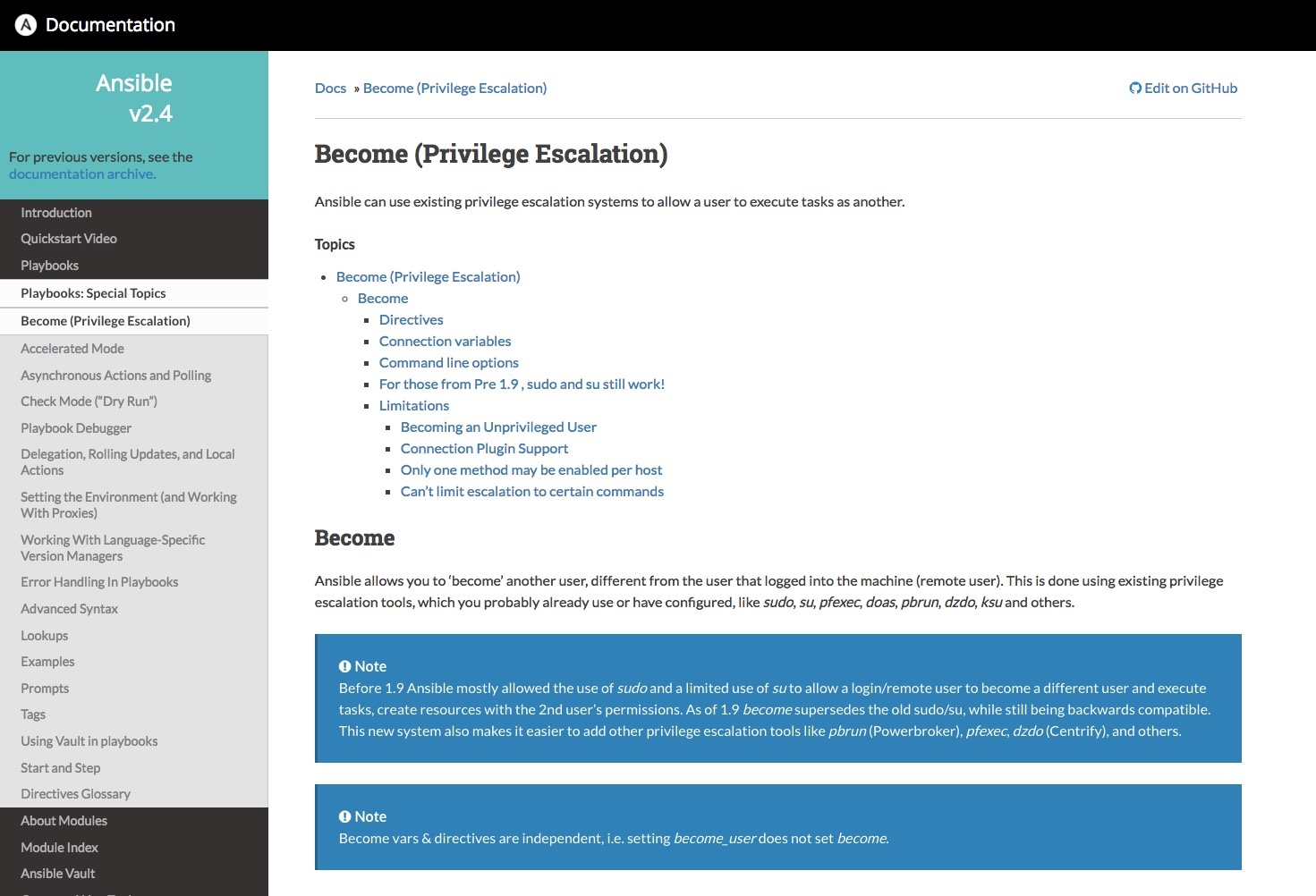 Ansible 2.0.x以下には、ユーザーがそれを認識していない場合にセキュリティ上のリスクとなり得る非特権ユーザーになることに関して制限があります。パラメータをモジュールファイルに代入からファイルをリモートマシンにコピーし、最後に実行することによってリモートマシン上で実行可能なモジュールが実行されます。
