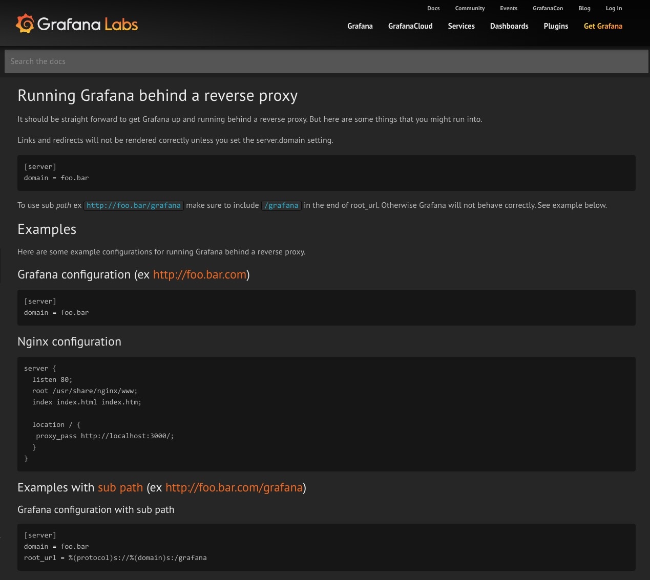 server { listen 80; root /usr/share/nginx/www; index index.html index.htm; location /grafana/ { proxy_pass http://localhost:3000/; } } |