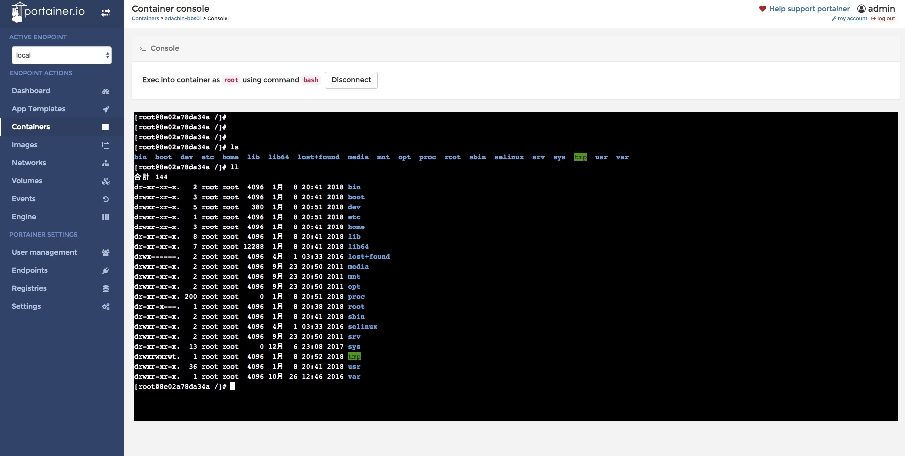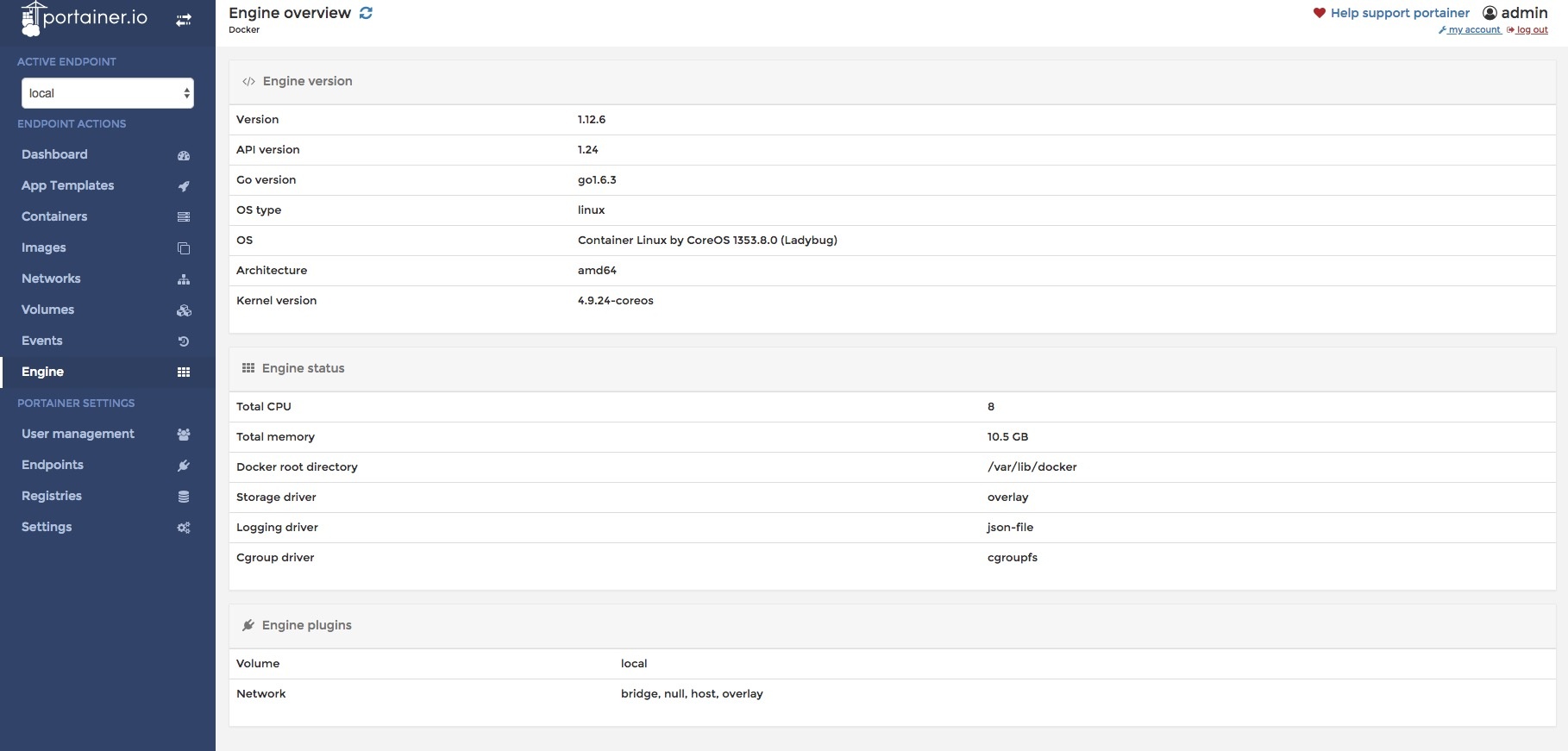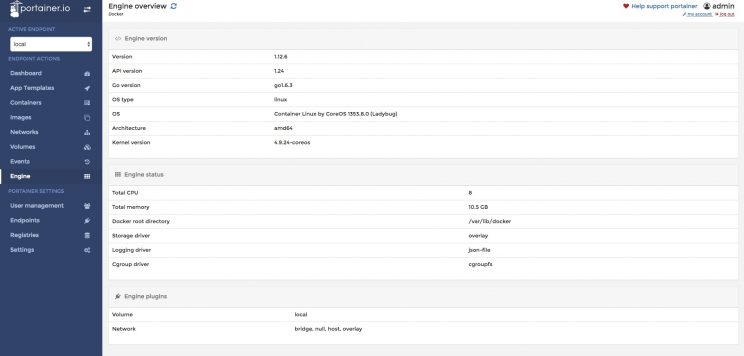 Portainerのバージョンやdockerホストのスペックなどさらに詳細が確認できます。