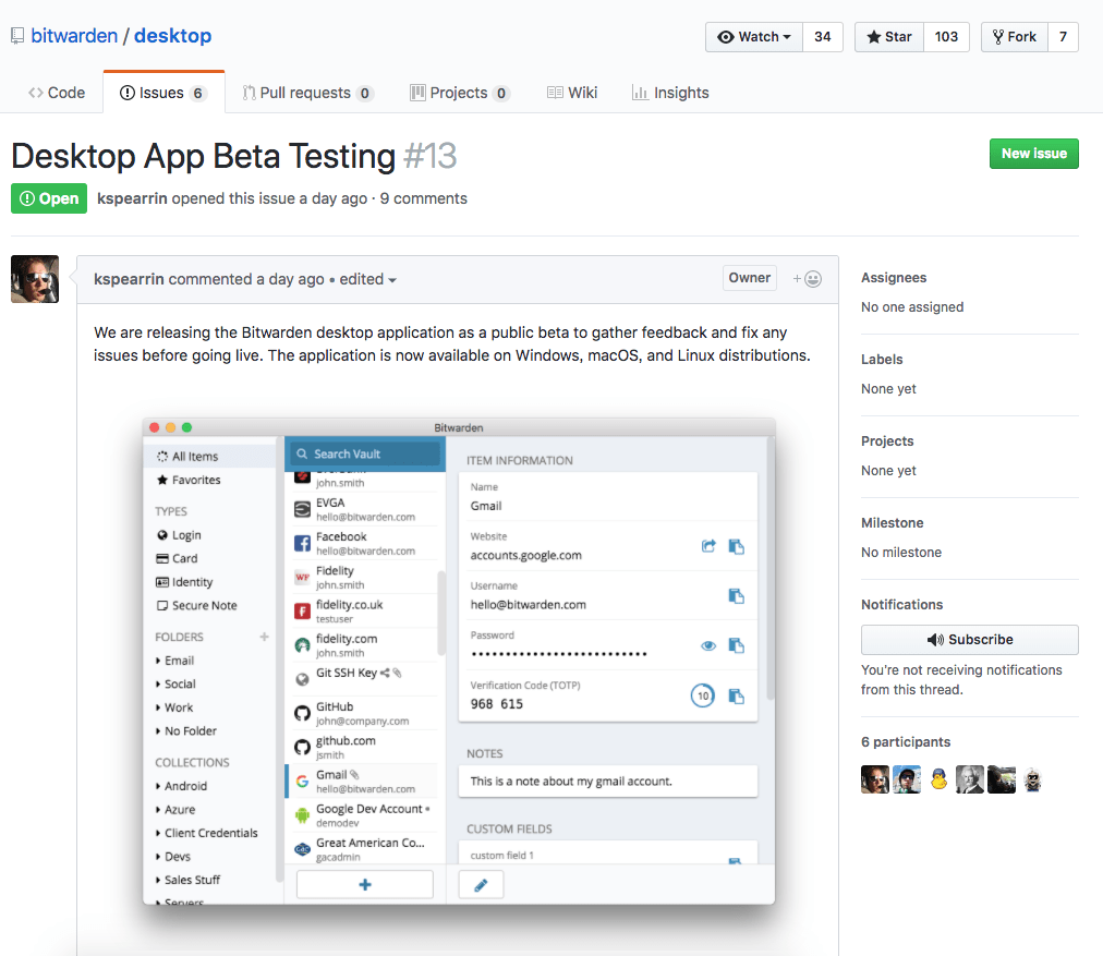 Bitwardenデスクトップアプリをベータ版として公開して、フィードバックをもらって修正するからよ。このアプリはWindows、macOSとLinuxで利用できるようになったから試してくれな。