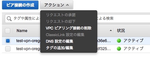先程東京リージョンで作ったvpc02をオレゴンリージョンのvpc01にピア接続をします。同様にvpc03もオレゴンリージョンに紐付けましょう。東京リージョンのピアリング接続で先程2のピアリングのリクエストの承諾をします。あとは各リージョンにEC2を構築して、各セキュリティグループは0.0.0.0/0全開放してください。