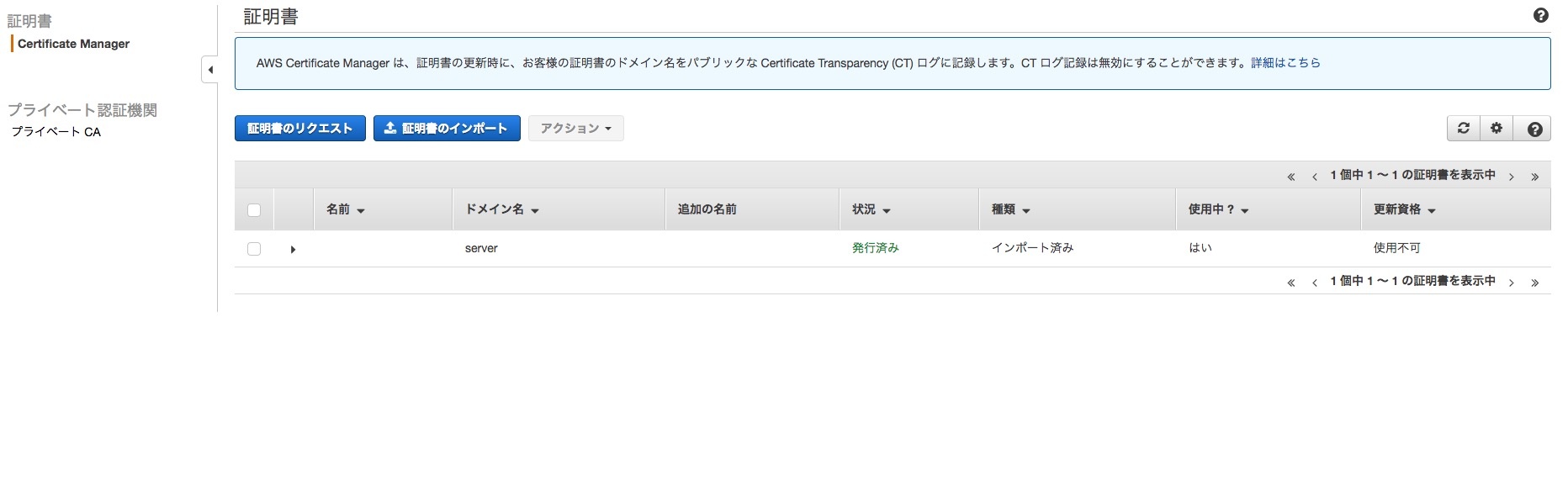 $ aws acm import-certificate --certificate file://server.crt --private-key file://server.key --certificate-chain file://ca.crt --region us-west-2 { "CertificateArn": "arn:aws:acm:us-east-1:******:certificate/27ec60c0-8937-4224-9c05-d88243239fde" } |