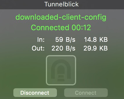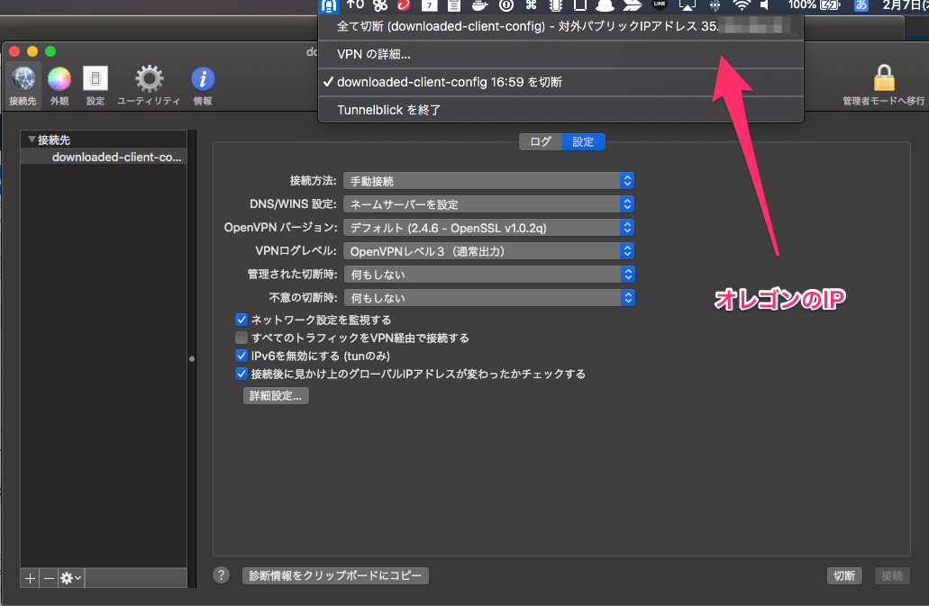 configurationファイルをtunnelblickへドラッグアンドドロップしてconnectします。