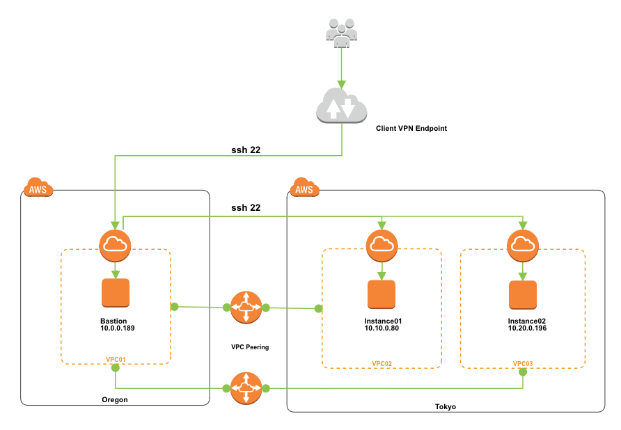 オレゴンリージョンのEC2から東京リージョン2つのEC2にSSHできればOK。リージョンまたぐのは凄いですね。